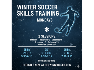The Red Wing Soccer Club is offering Skills Training on Mondays, January 5 to February 23 (there are no classes on 1-19 or 2-16). All classes will be held at RipWing in Red Wing.